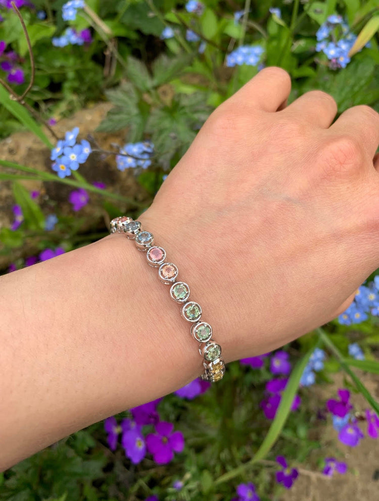 Vintage 7.8ct Fancy Color Zafiro en pulsera de oro blanco de 9K, pulsera de tenis, regalo de cumpleaños, regalo de Navidad