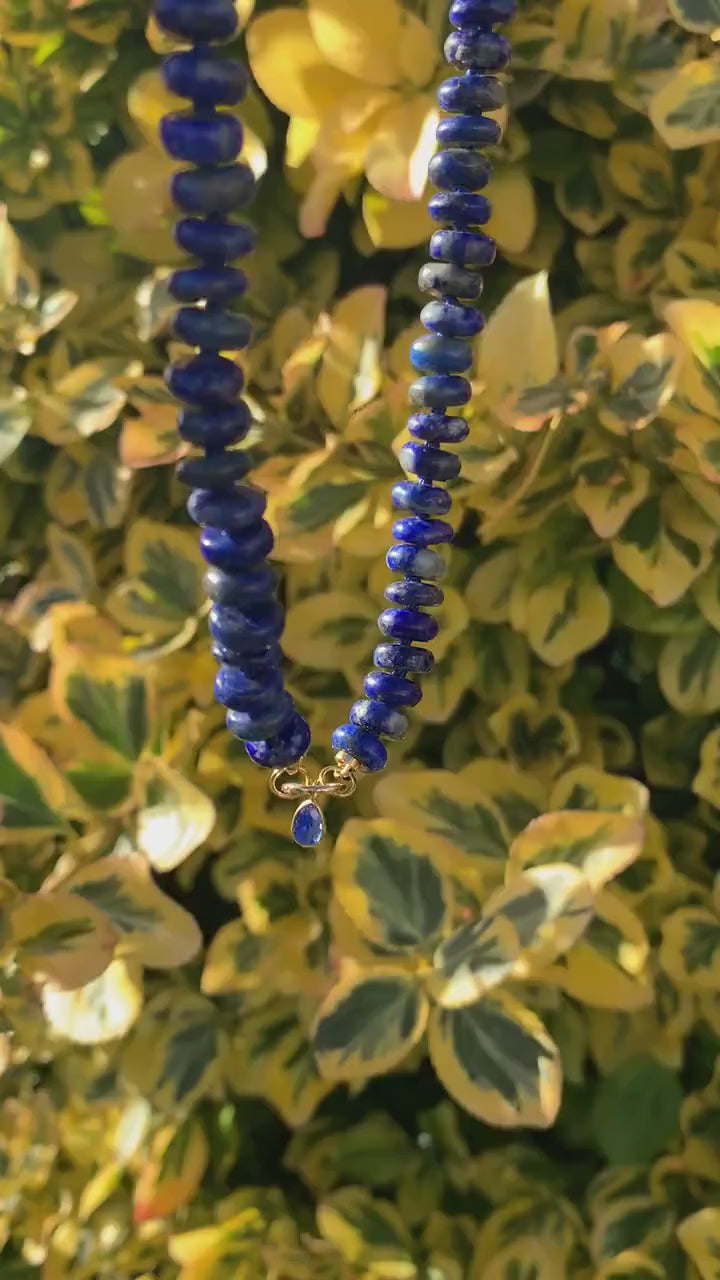Encuentre a la venta un encantador collar anudado con bucles abiertos de lapislázuli semiprecioso natural de color azul intenso con puntas de cuentas de oro macizo de 18 quilates, un conector redondo de oro amarillo de 14 quilates y un dije de oro de 18 quilates de cianita azul natural en forma de pera adjunto.