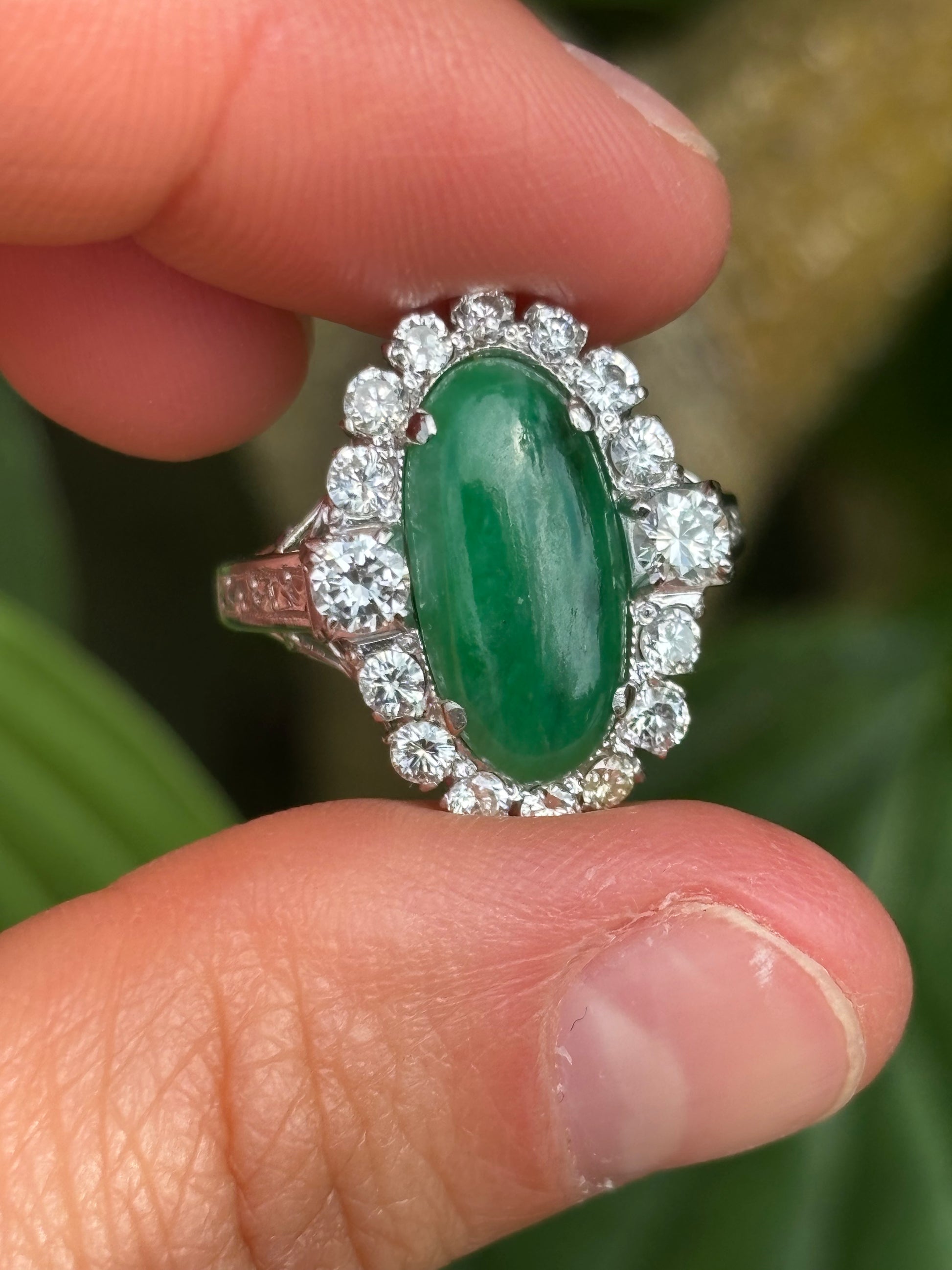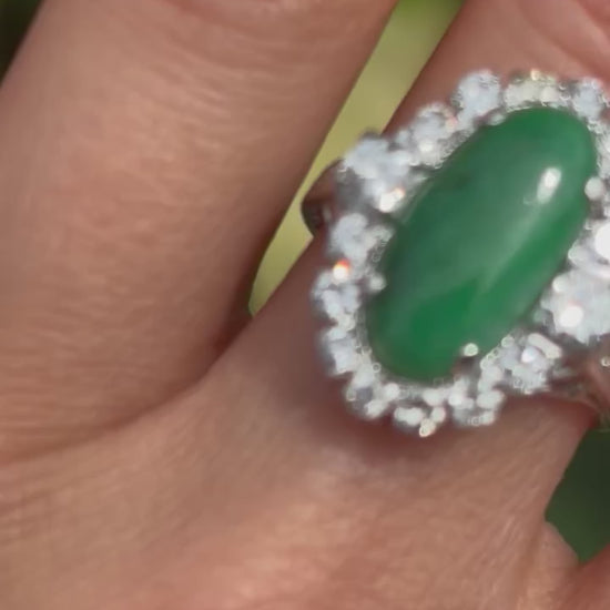 Stunning Pre-loved Jade & Diamond set in 14ct White Gold. Such an incredible ring crafted with intricate shoulders and top and extremely sparkly diamonds. Unhallmarked but tested as 14ct gold. This ring is ideal to be worn as a Cocktail Ring/Engagement Ring/Anniversary Ring/Birthday Gift and more. You choose the occasion, we have the gift.