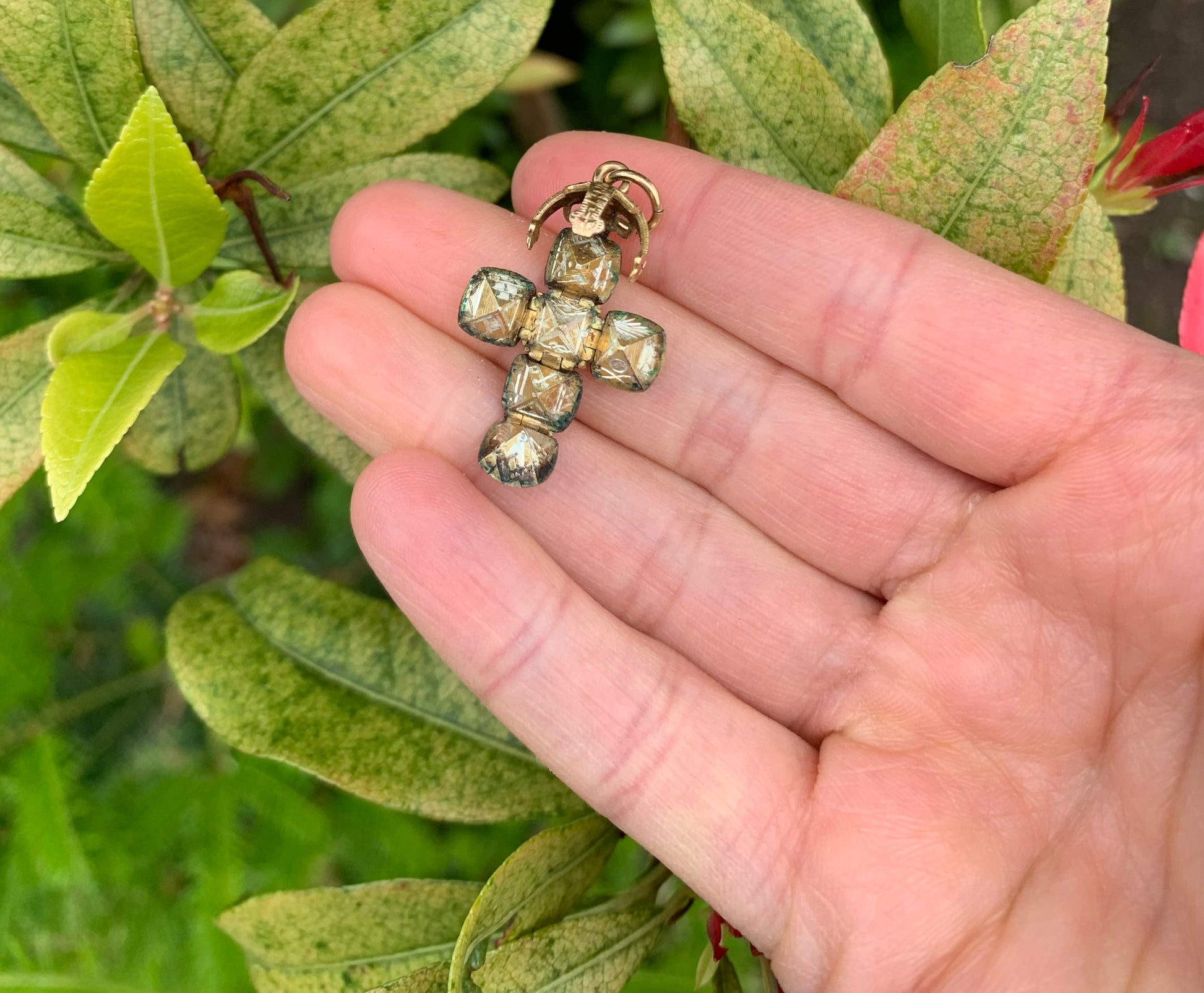 The cross measures 22mm in length 18mm in width. It has a nice and large bail to accommodate on a chain. It opens and shuts securely.