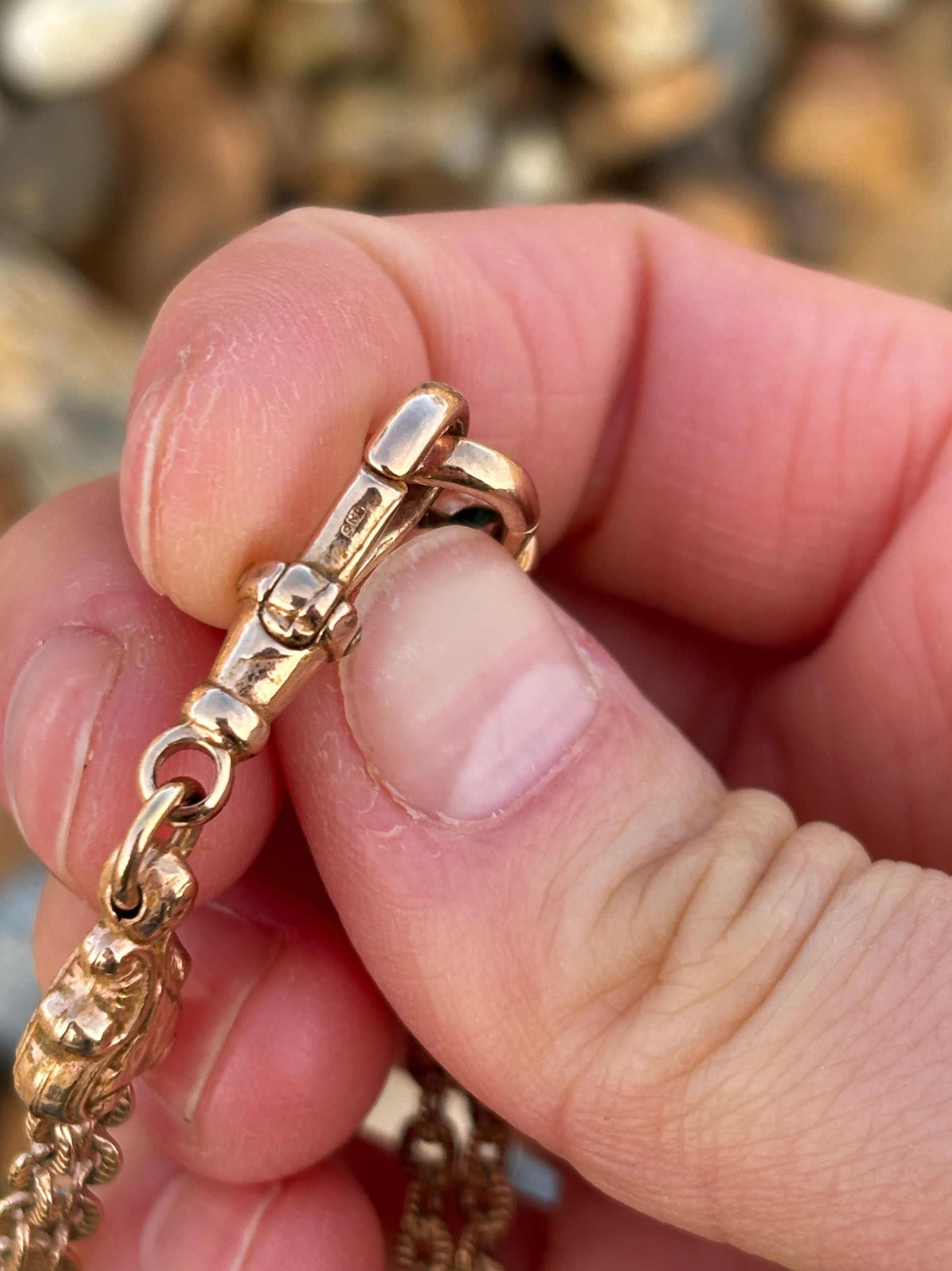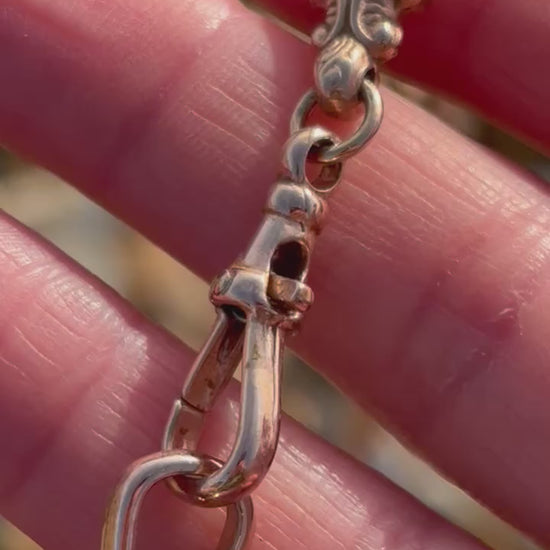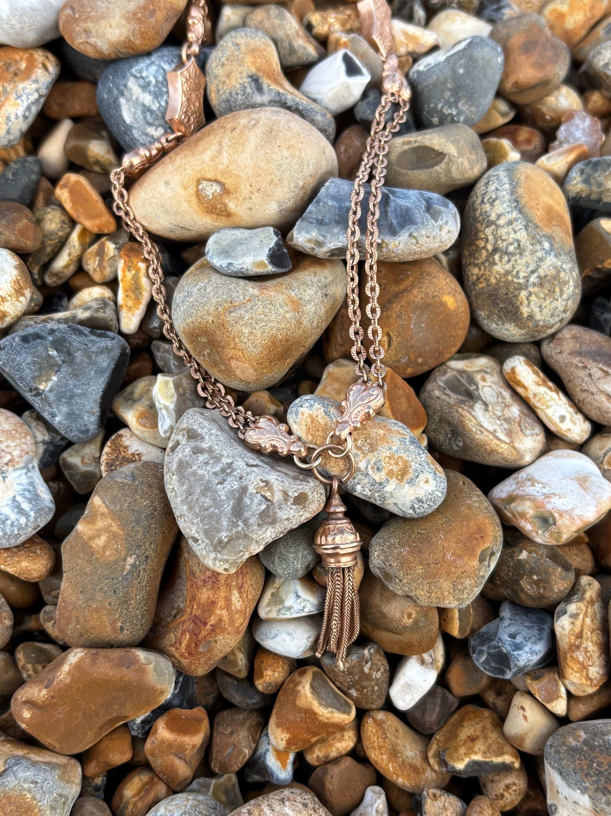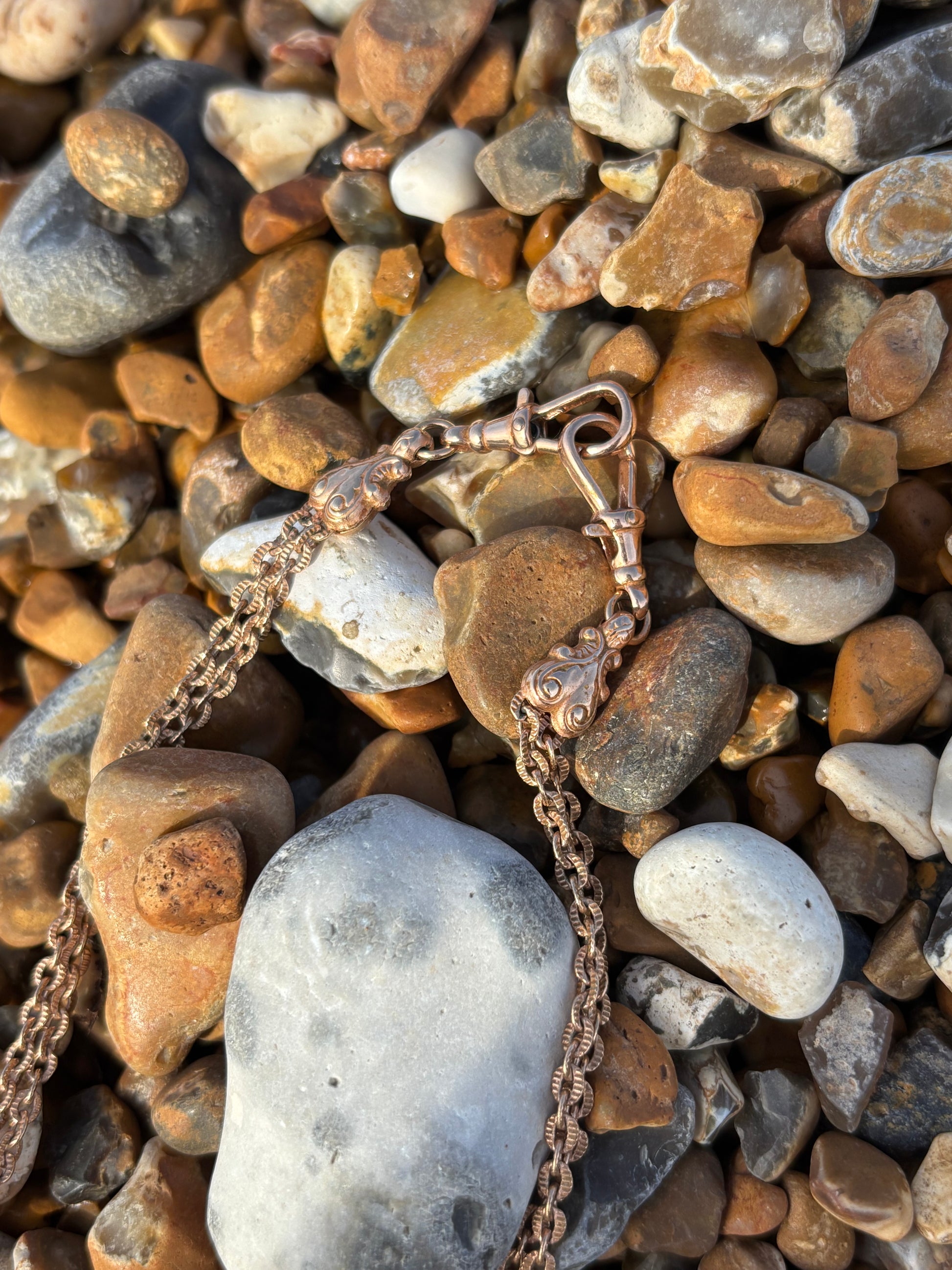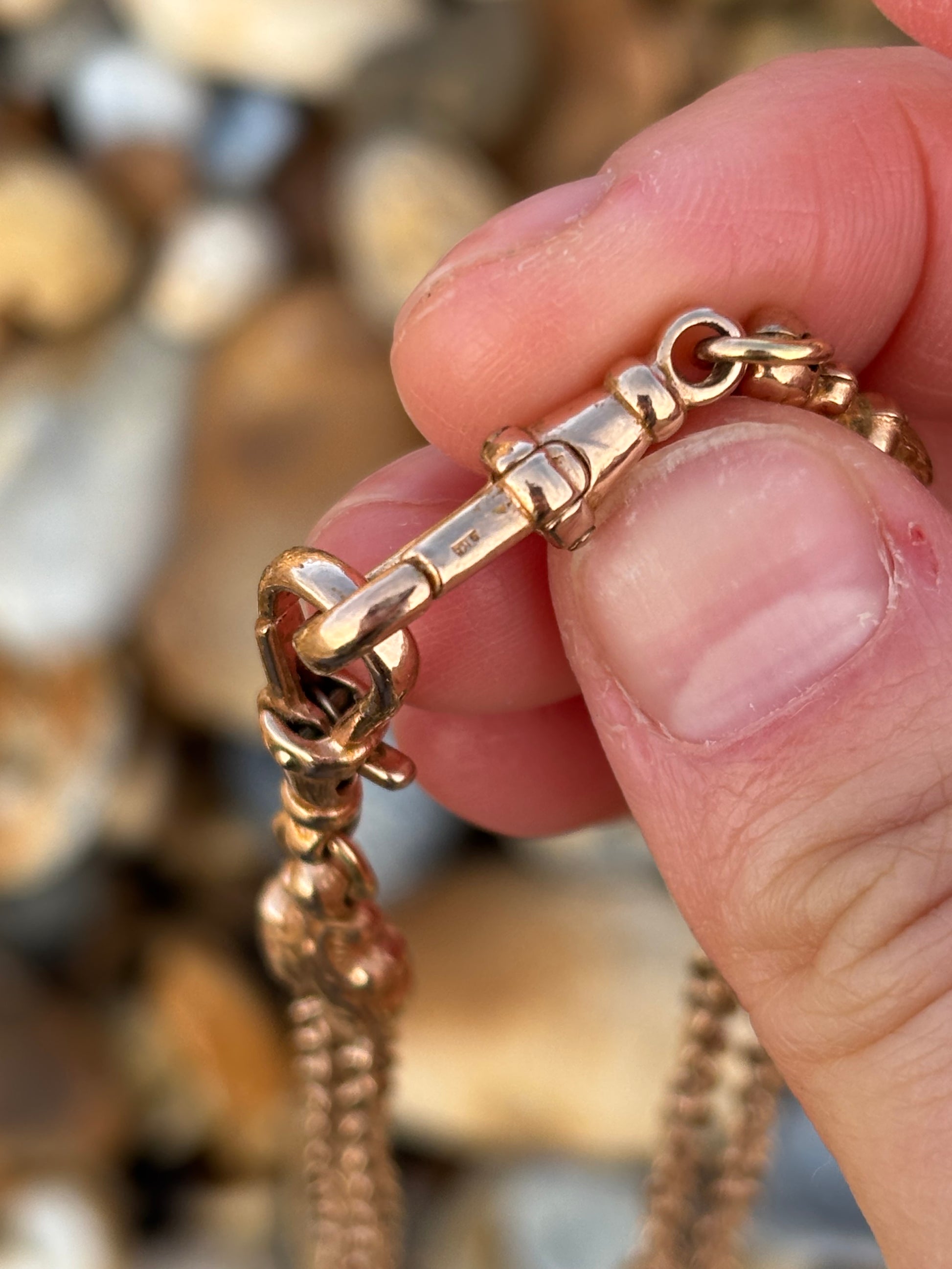 Please find for sale a Rare and Fabulous Antique Solid 9ct Rose Gold Longuard Albertina Fancy link with a tassel and two dog clips as clasps fully hallmarked for 9ct gold.