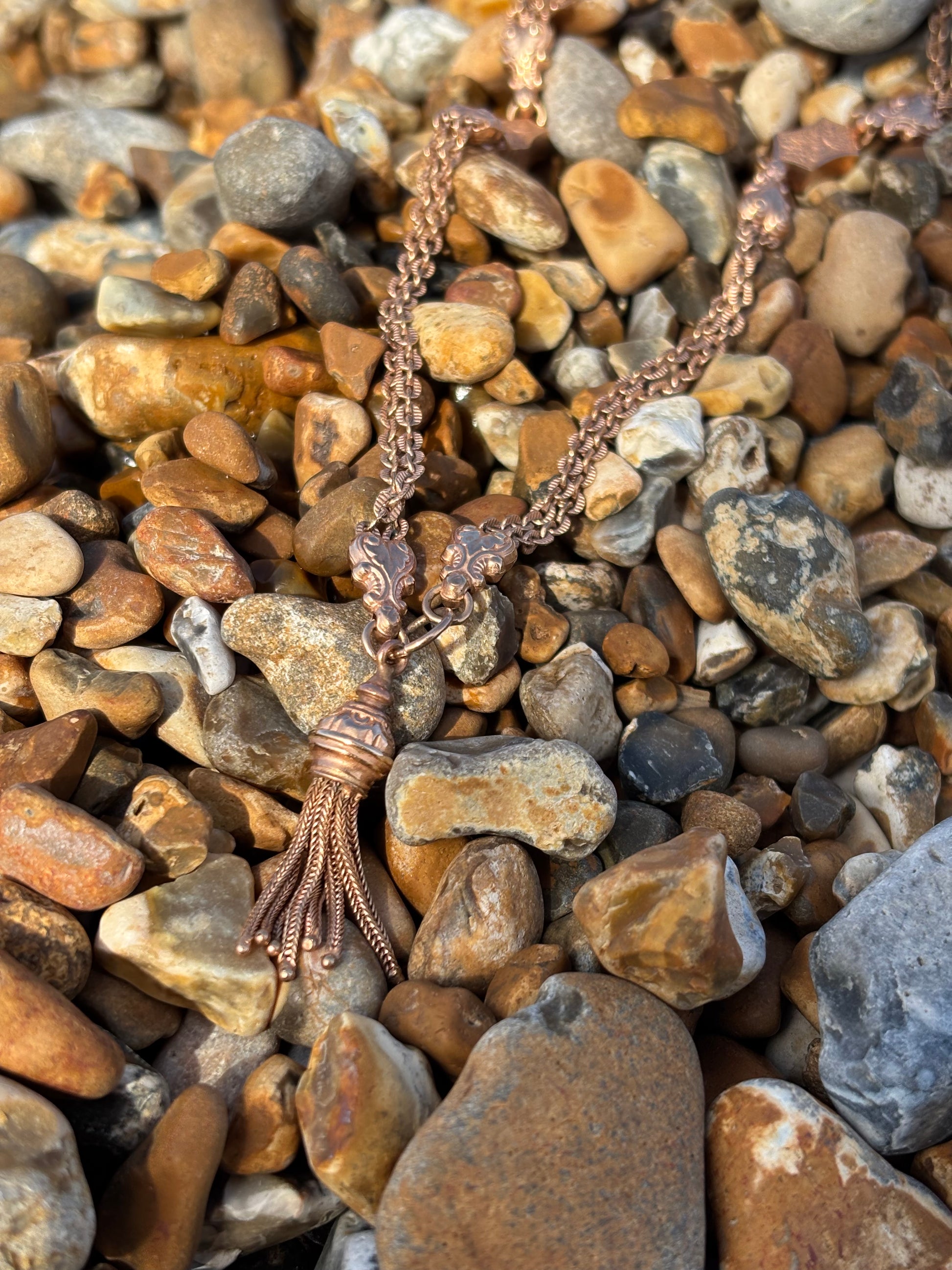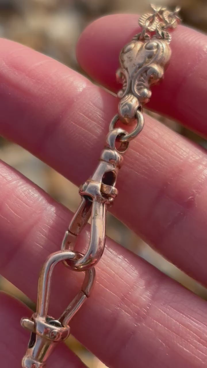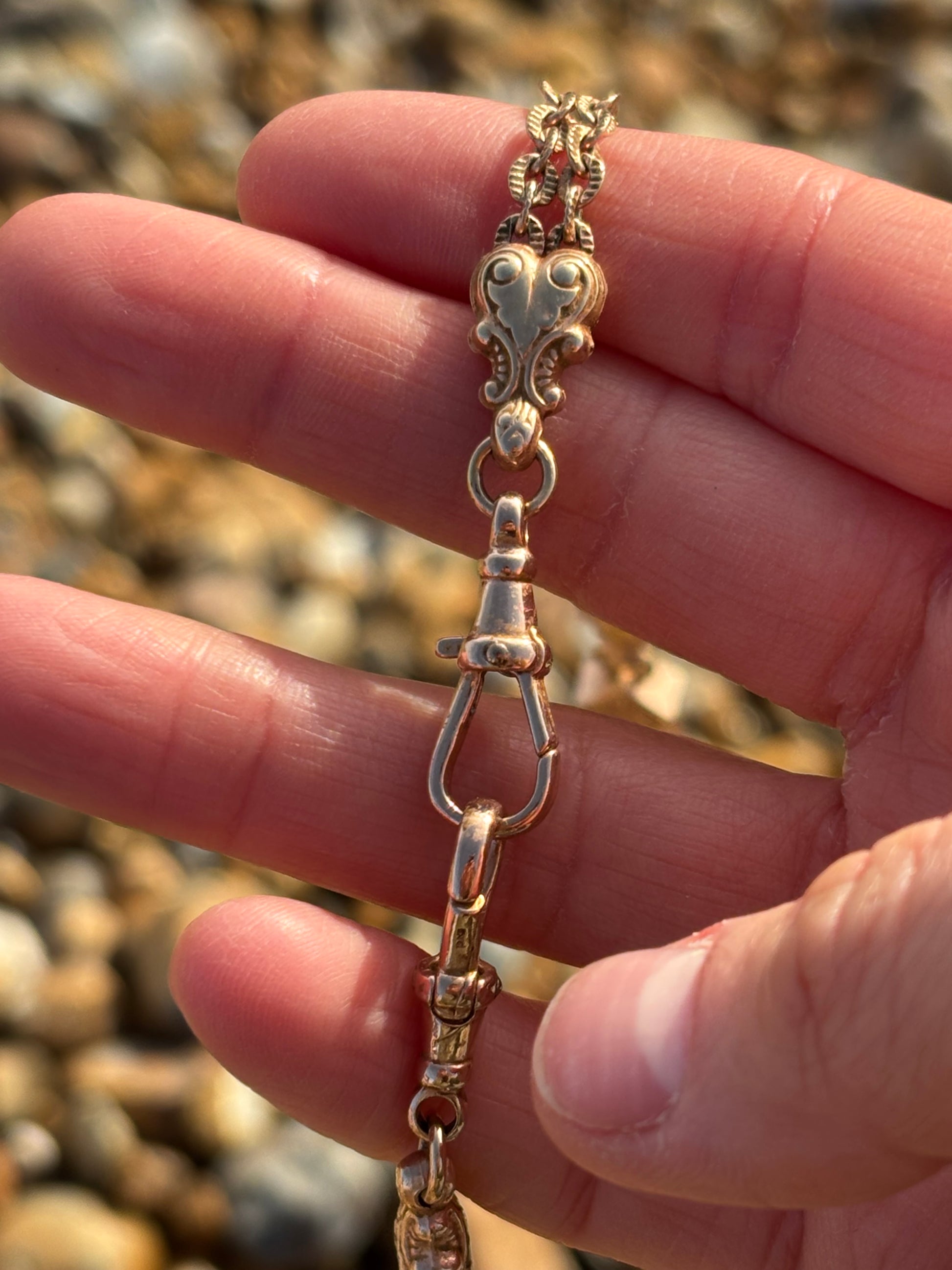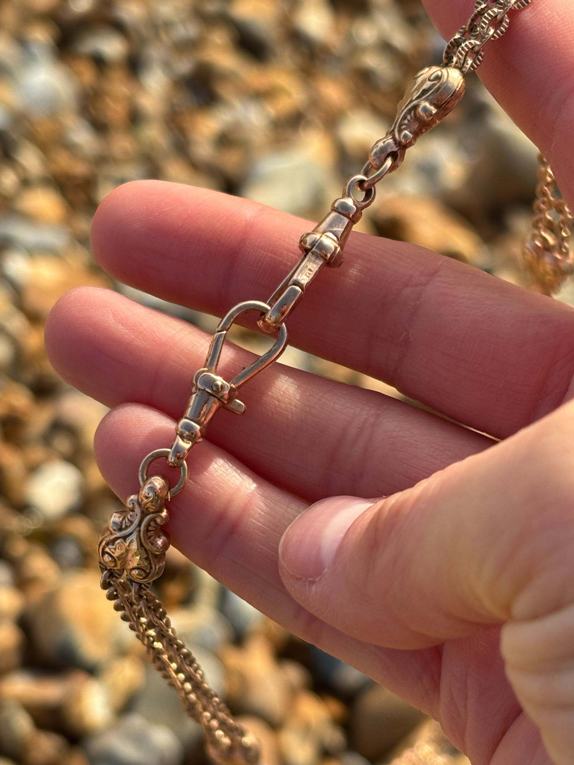 Please find for sale a Rare and Fabulous Antique Solid 9ct Rose Gold Longuard Albertina Fancy link with a tassel and two dog clips as clasps fully hallmarked for 9ct gold.