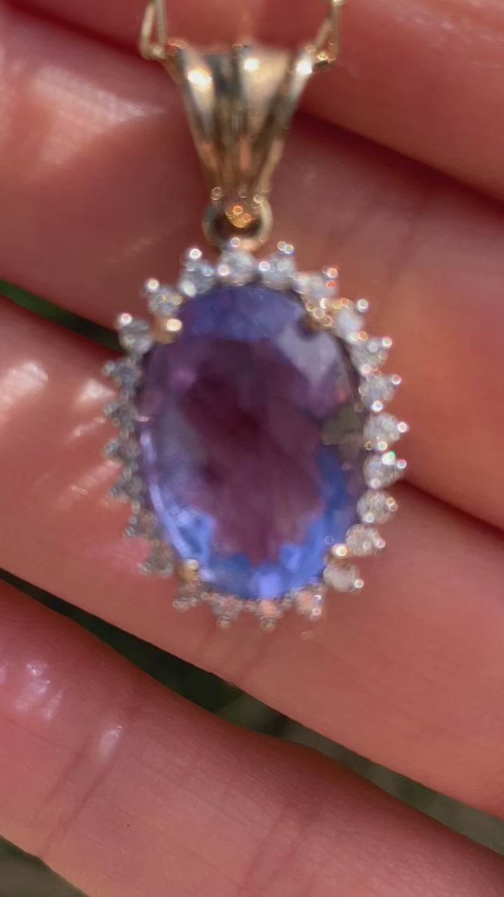 Please find for sale a Beautiful Vintage 0.36ct Diamond & 6.45ct Chequer Cut Colour Change Flourite Pendant suspended on a 14ct gold chain necklace. Both pendant and chain are hallmarked. This is a good size pendant measuring 26mm in Hight and 14mm in width set with 24 dazzling brilliant cut diamonds each measuring approx. 1.5mm and a 14x10mm oval shape colour change Flourite in the centre. The total weight is 5.21 grams.
