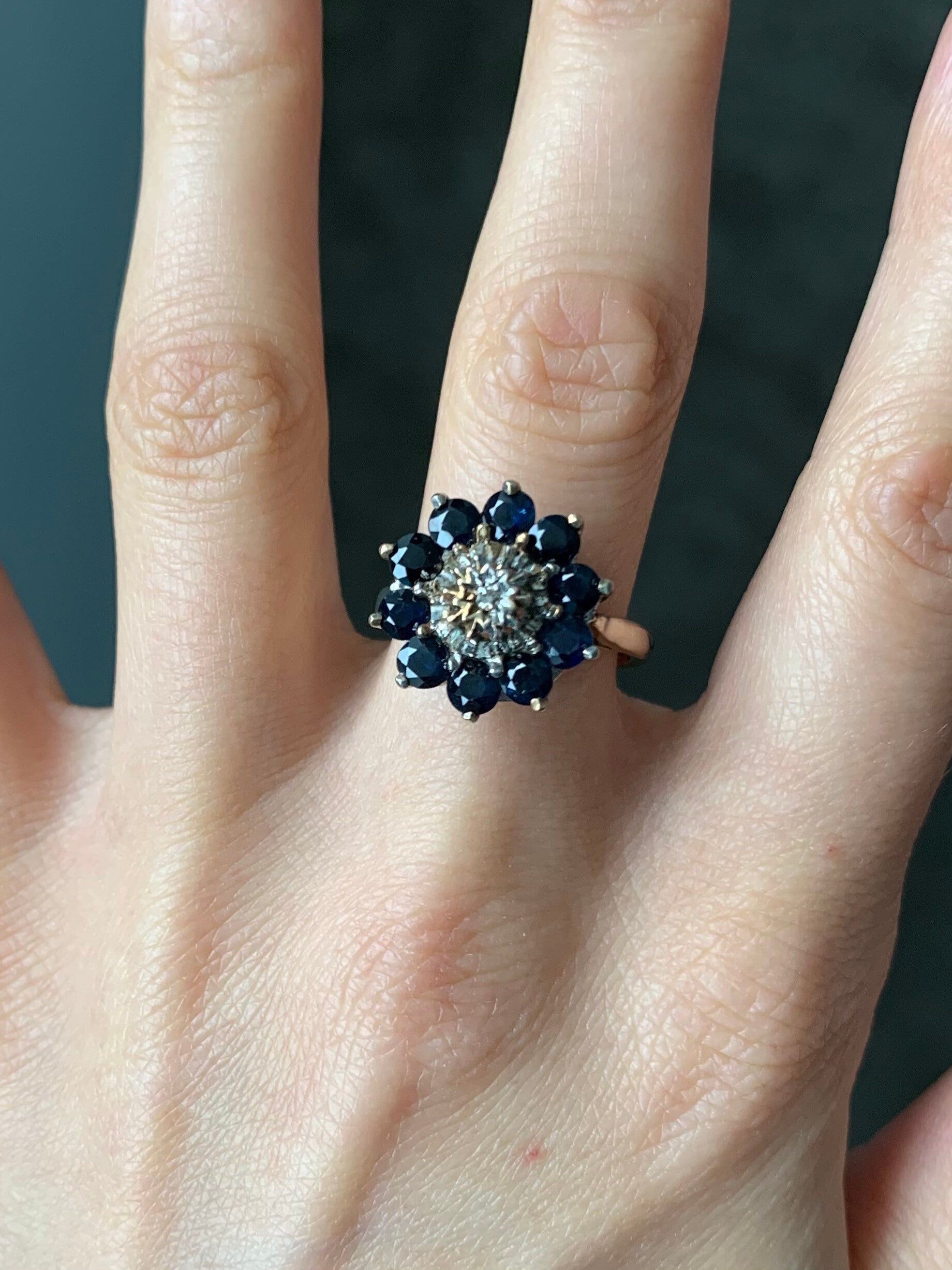Beautiful vintage approx. 1.5ct sapphire & 0.015ct diamond mounted in solid 9ct yellow gold cluster ring perfect as engagement anniversary birthday gift, Christmas Gift and more. Treat yourself or your loved ones with a special gift. Hallmarked 375 on the band. Dispatched with Royal Mail Special Delivery.