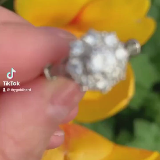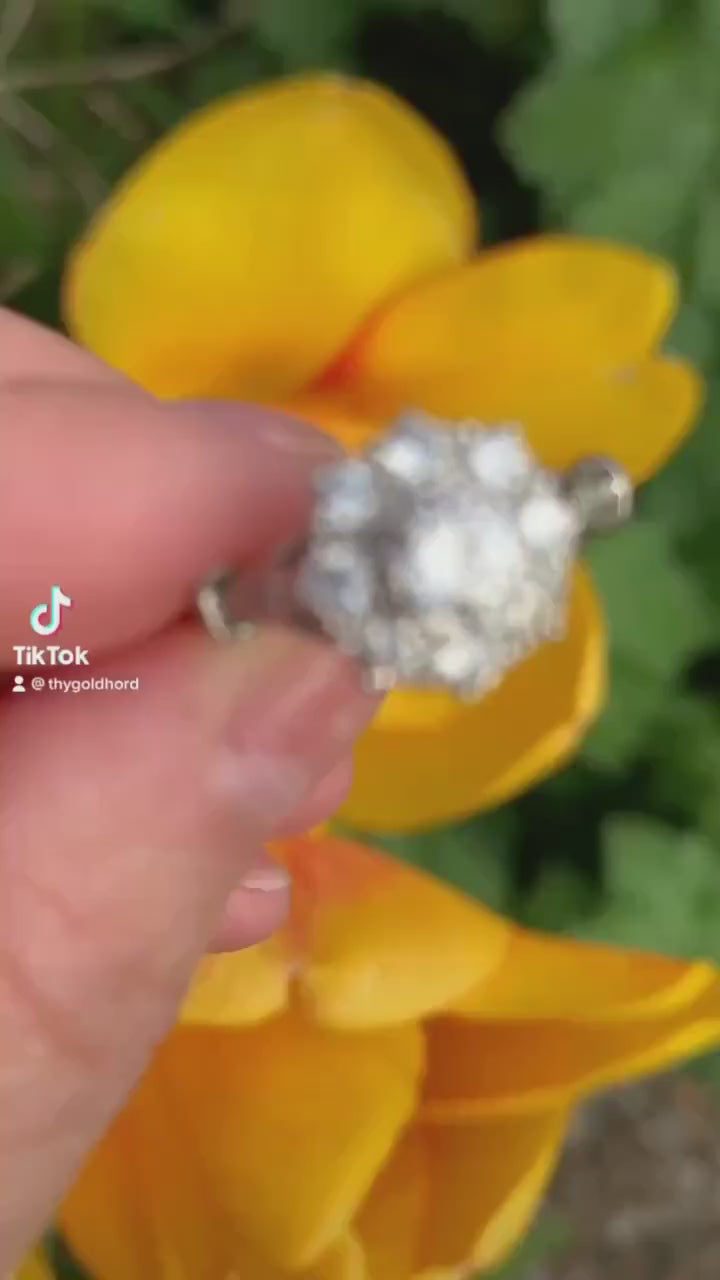 Vintage Diamond Daisy Cluster Ring set in Platinum, stamped ‘plat’ inside the band. Perfect as Engagement Ring, Anniversary Ring, Birthday Gift and more. You choose the occasion, we have the gift. Dispatched with Royal Mail Special Delivery.